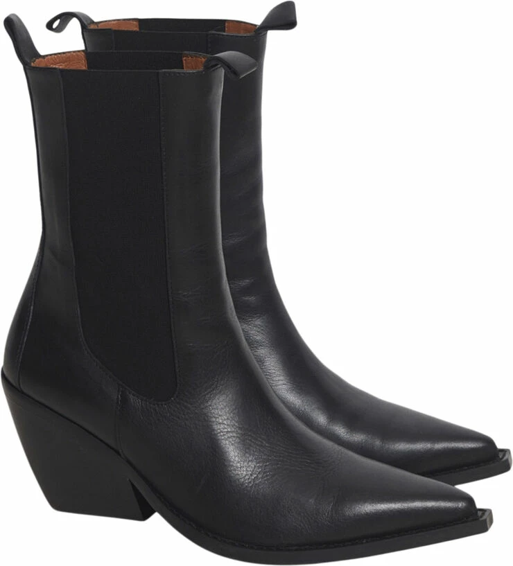 “These calf-height pistol boots have a pointed toe, elasticated panel at the ankles, and pull tabs on top. Wear with a midi-length dress for a modern look. Heel height: 8 cm”