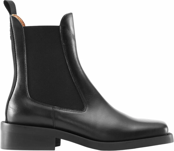 Disse ankelstøvler i glat læder kommer med en lav, firkantet hæl, tung, firkantet snude, brede kanter og elastisk panel i chelsea-stil.