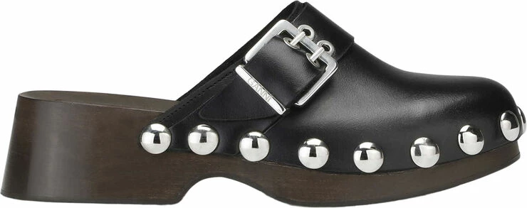 Retro slip-on-clogs i læder med nitter, remme med metalspænder og plateausåler af træ.