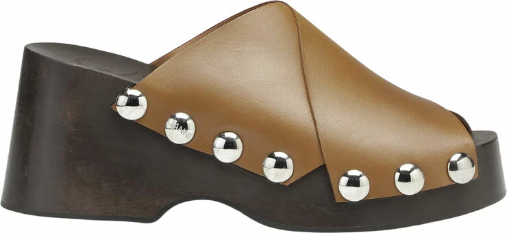 Retro, chunky clogs med brede læderstropper henover foden, åbent til tæerne og kilehæl af træ med tynd gummisål.