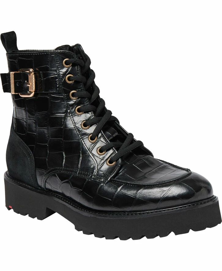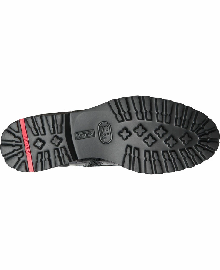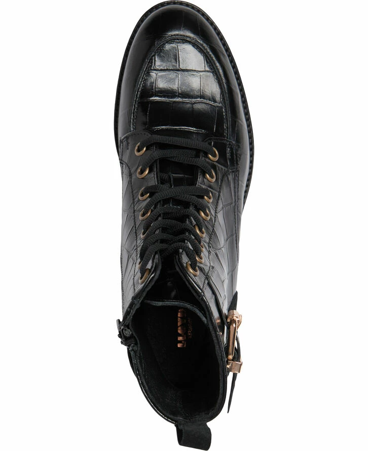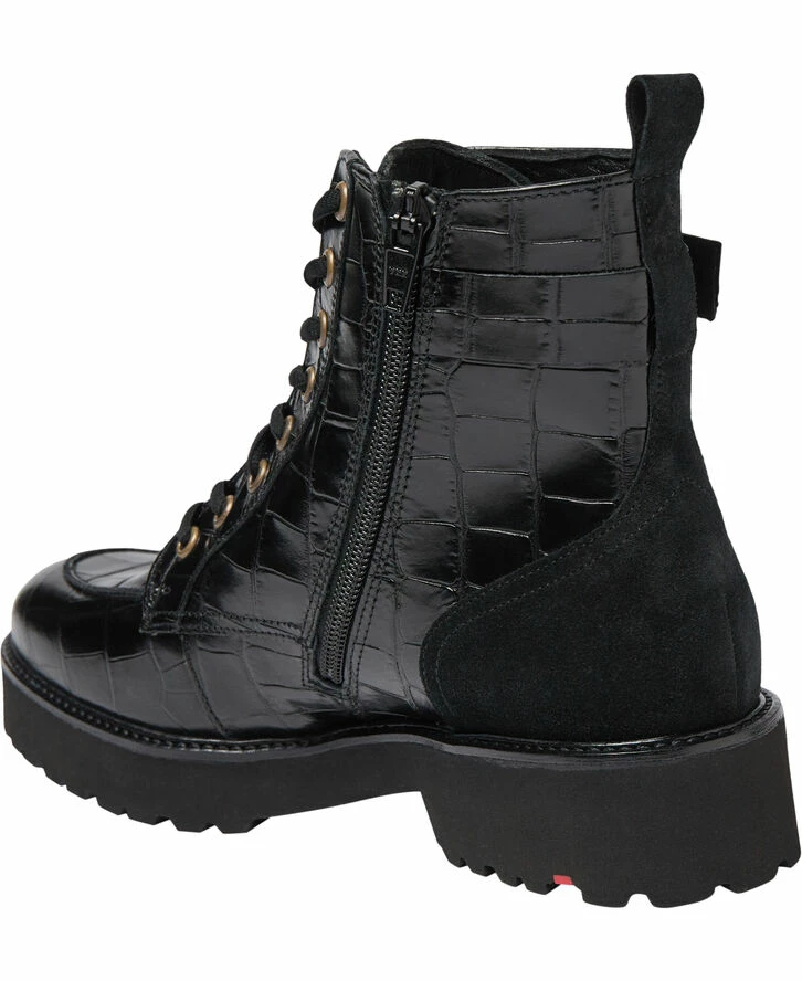 Støvle fra Lloyd i en lækker kvalitet med det fineste krokodilleskindsmønster. Støvlen har snørebånd på fronten, lynlåslukning på indersiden, et elegant spænde på ydersiden, en grov sål samt en mokkasinsyning langs den runde snude.