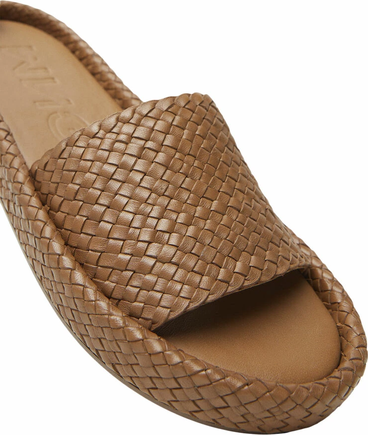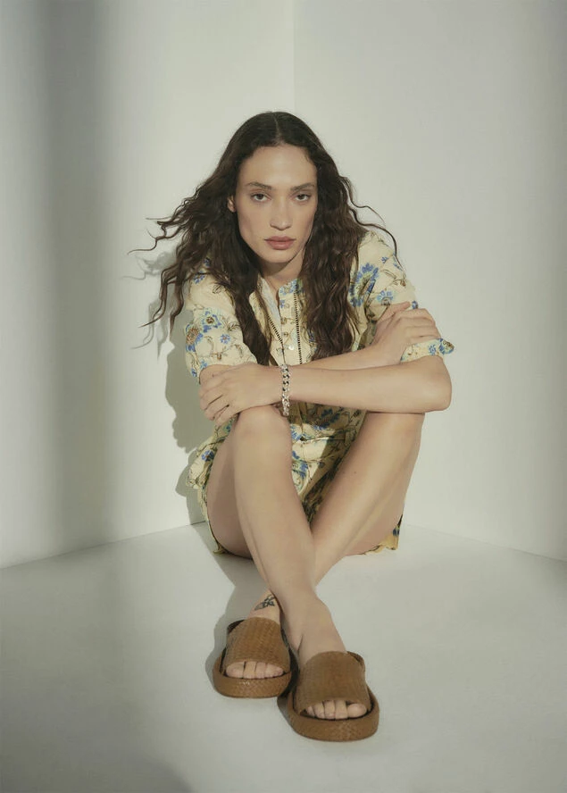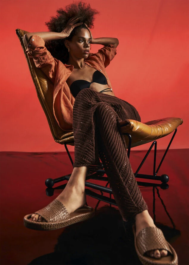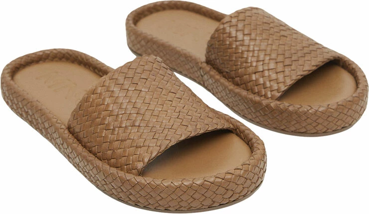 Committed Collection, 100% bovine leather, braided design, rounded toe, flat, swimwear collection.